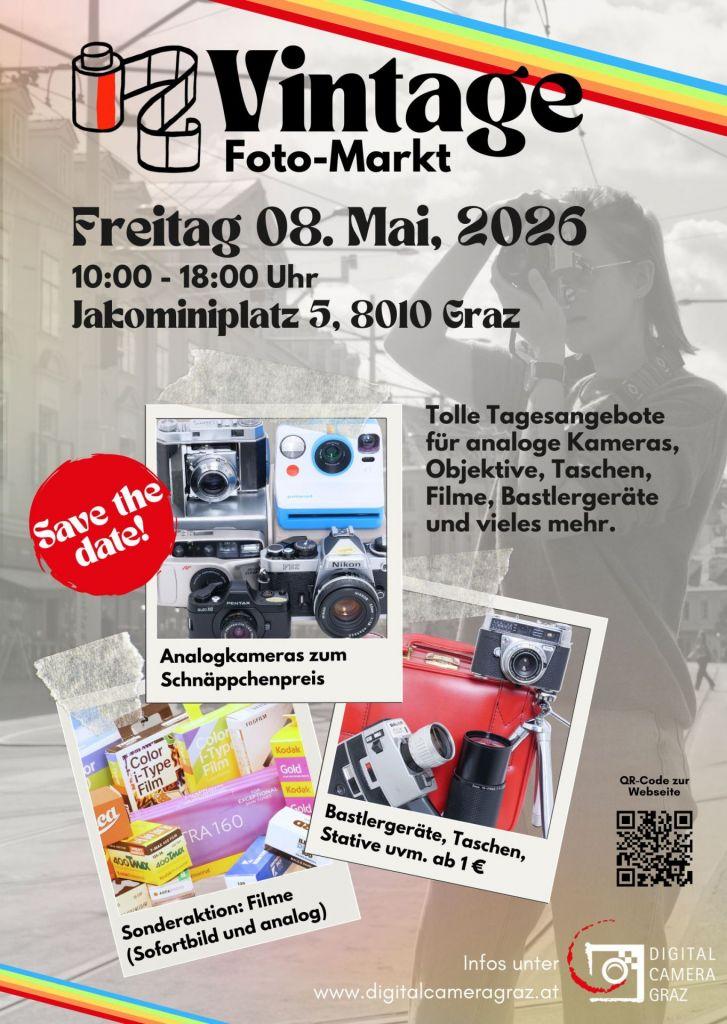 Am 8. Mai 2026 werden Sie tolle Tagesangebote für analoge Kameras, Filme, Taschen und vieles mehr bei unserem Foto-Flohmarkt finden.